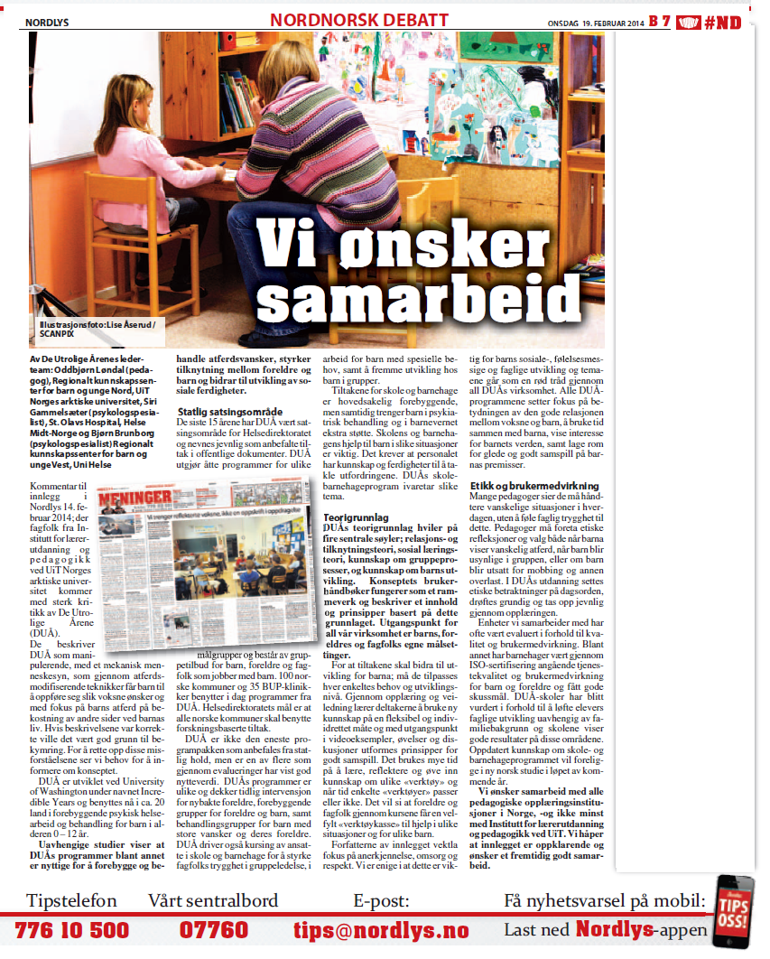 "Vi ønsker samarbeid". Avisinnlegg fra De Utrolige Årenes lederteam.