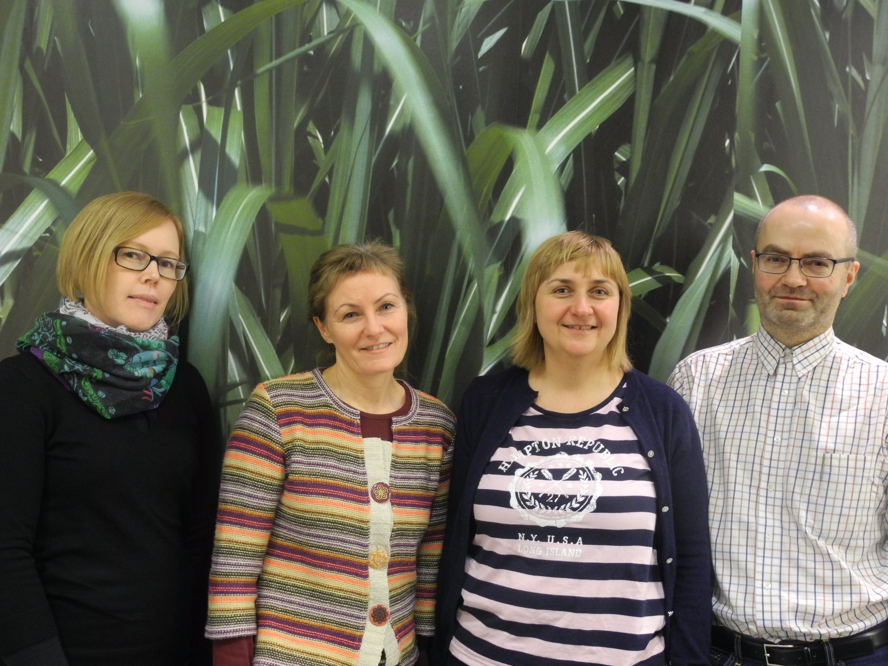 | Doktorgradstipendiatene Gro-Hilde Ulriksen, Bente Christensen og Camilla Bjørnstad jobber sammen med Gunnar Ellingsen for å utvikle en elektronisk kurve. Foto: Johanne Røe Mathisen. |
