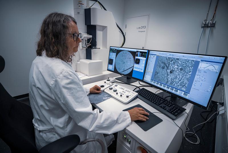 Randi ved ett av de fem elektronmikroskopene ved KAM, her et Transmisjons elektronmikroskop. Foto: David Jensen /UiT
