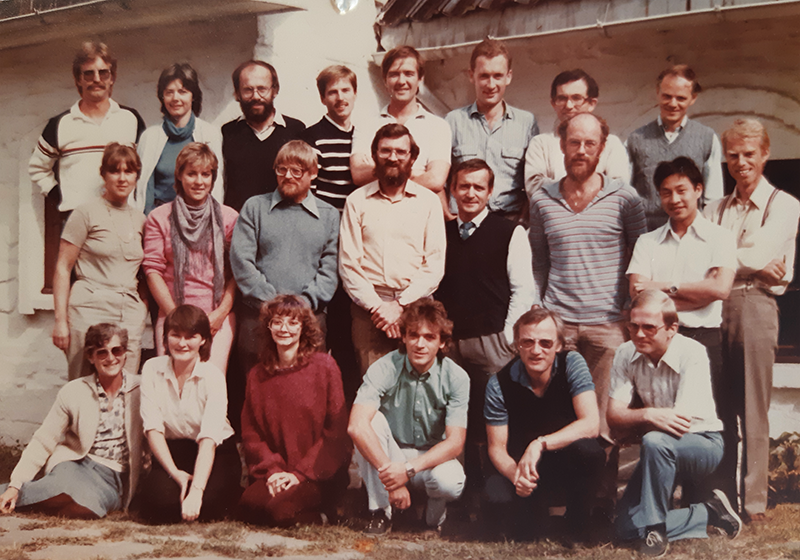 25 år gamle Randi smiler på første rad i burgunderrød genser. Deltakere og lærere på kurs i Stereologi, Sundvollen 1985. Foto: Privat