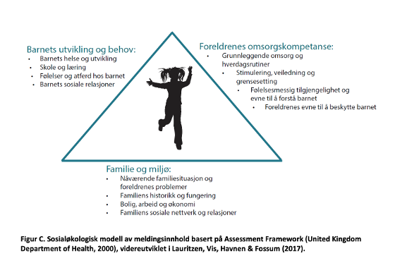 Felles for disse fagsystemene er at de tre hovedområdene som gjøres gjenstand for undersøkelse i en barnevernsak illustreres ved en trekantmodell. Trekantmodellen brukes som utgangspunkt for å kategorisere ulike saksforhold relatert til henholdsvis barnets helse og utvikling, foreldrenes omsorgsutøvelse og belastninger i familie og miljø. Disse hovedområdene har utspring i en økologisk forståelse av barns behov og utvikling. Sentralt i denne modellen er at barnets utvikling ses som et resultat av samspill mellom faktorer knyttet til barnet selv og barnets utviklingsmessige behov, foreldrenes omsorgskompetanse og forhold i familie og nærmiljø.