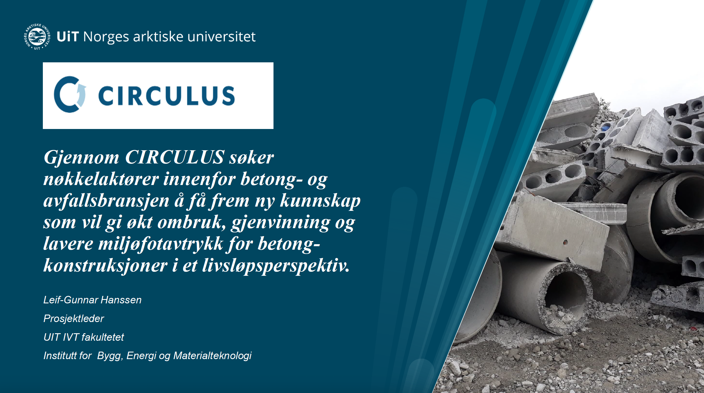 In building and construction projects, large material resources are seized throughout the life of the building or construction. There is an increasing focus on optimizing resource use and stricter demands are being made for better resource utilization. National targets have been set for the construction industry to achieve a higher degree of circular economy. With this, circularity in the concrete industry has become an important area of focus. The Norwegian Concrete Association's environmental committee issued December 2022 NB Report 10. "Circular economy for concrete" and the Concrete Innovation Cluster (CIC) have defined "Rehabilitation, reuse and recycling" as a focus area.