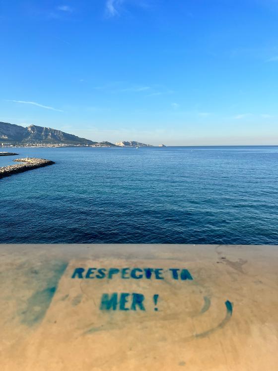 Photo by E. Murray: “RESPECTE TA MER!”. Spray-paint art along La Corniche in Marseille, France.
