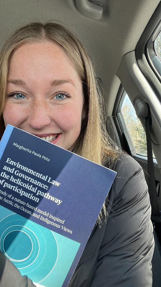 Emily holding her copy of Environmental Law and Governance: the helicoidal pathway of participation after it travelled from Italy to Canada.