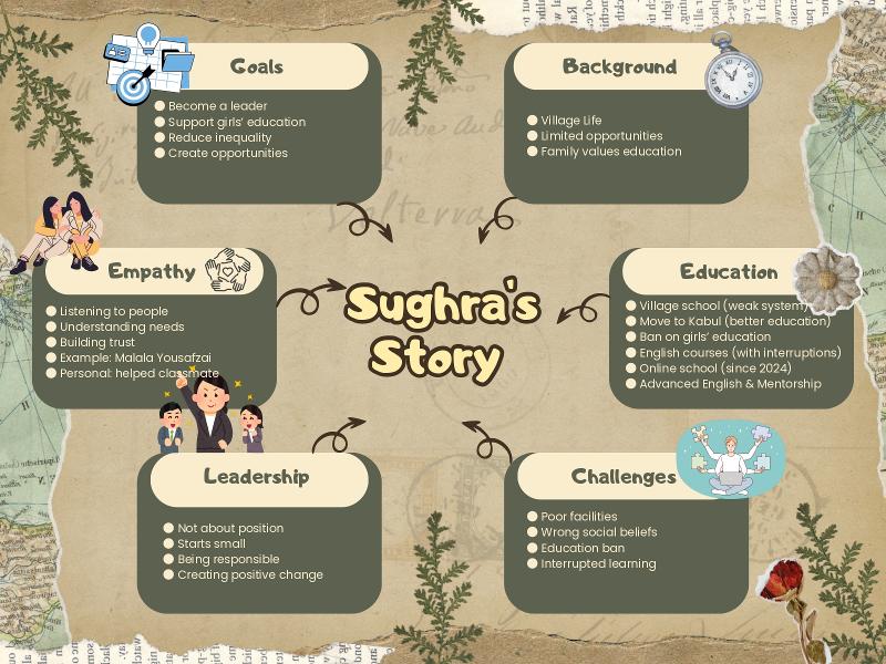 Hello! My name is Sughra Zuhad. I have grown up in an environment where education and having access to any opportunity have not always been easy, but this situation and environment made me think about the role of education, the voice of women and personal responsibilities. Thanks to this, when I see the people around me and the environment I noticed how important education is. My personal experiences shaped my perspective on leadership, and shown me that leadership does not start with an official position, but from small decisions, small starting, and things we learn daily.