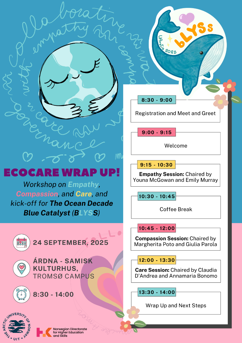 The ECOCARE Wrap-Up event will take place on September 24, 2025, at Árdna - Samisk Kultuhus, Tromsø Campus, from 8:30 to 14:00. This workshop focuses on Empathy, Compassion, and Care, marking also the kick-off of The Ocean Decade Blue Catalyst (BLYSS) project (UArctic 580512127). The program includes sessions on empathy, compassion, and care, chaired by experts, alongside networking opportunities and discussions on collaborative governance. The day concludes with a session on next steps for the initiative.