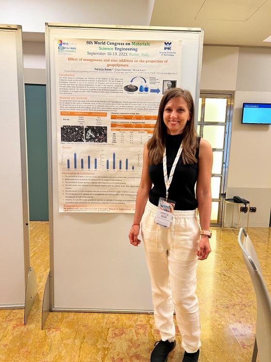 A poster presenting the results of research carried out as part of the GEOSUMAT project was presented and directly participated in the conference by Mrs. Patrycja Bazan. The poster was titled: "Effect of manganese and zinc addition on the properties of geopolymers" and its authors were: Patrycja Bazan, Kinga Pławecka and Michał Łach. The conference was also attended by doctoral students from the Krakow University of Technology: Agnieszka Bąk and Joanna Marczyk. |