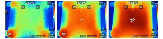 Thermal camera showed the gradual temperature rise and heat spread on the top of the board at the beginning, midpoint and end of the experiment The thermal imaging camera also provided a deeper insight into the evolution of heat in the studied construction tile, and observations can be used for further increase of self-heating effectivity by a different design (size, shape) and positioning of electrodes.