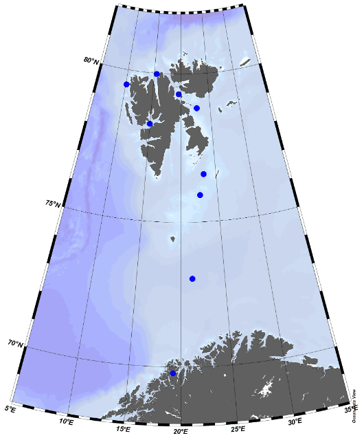 A total of 9 stations were sampled, traversing across the Barents Sea to the East of Bjørnøya and passing through the Hinlopen strait from the south before following the coast of Spitsbergen to the west and south before turning eastwards into Isfjorden.