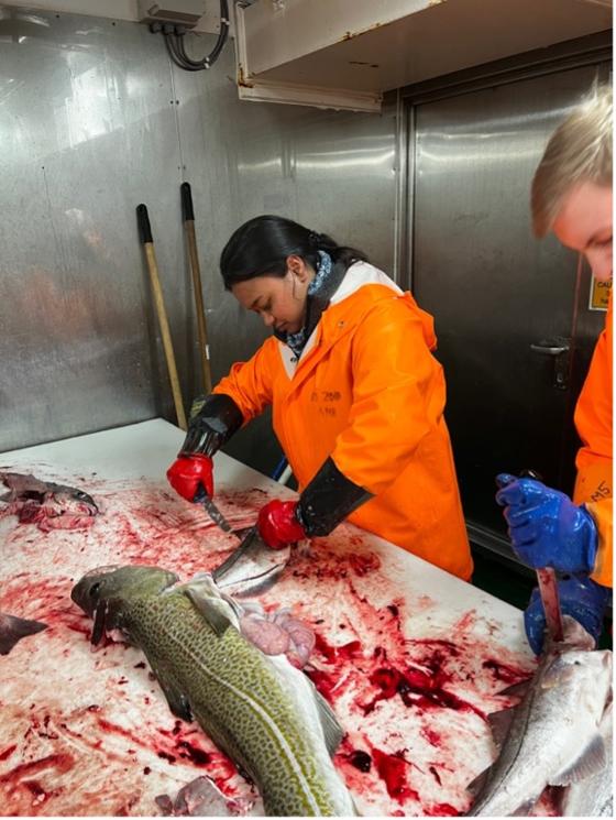 The research cruise was a part of Bachelor´s degree program offered by the Biosciences, Fisheries and Economics Faculty, supervised by Dr. Kim Præbel for which Anju and Vanessa will also be leading a practical session. During the cruise they also collected different flora and fauna which were identified by the students to estimate the biodiversity of the fjords. The students also sampled from freshwater and migratory Cod which will be used later during the practical sessions. This opportunity allowed Anju to collect samples for her PhD project and also assist the students which was a great learning experience.