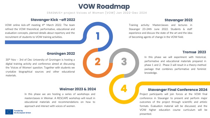 Voices of Women (VOW) is a transnational educational project funded by the ERASMUS+ program (2021-2024). The project brings together students and teachers to work on strengthening and ensuring women’s rightful place in the historical, contemporary and future arenas of artistic production. VOW contributes to common EU values in relation to cultural awareness anchored in historical heritage which have not received their fair share of attention, analysis, interpretation, and performance.