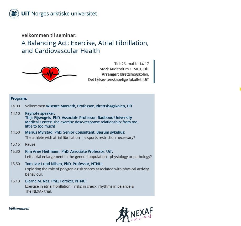 The School of Sport Sciences at Helsefak is pleased to invite you to the seminar "A Balancing Act: Exercise, Atrial Fibrillation, and Cardiovascular Health" on May 26 at 14:00 at Auditorium 1, MH, UiT, with the following programme: