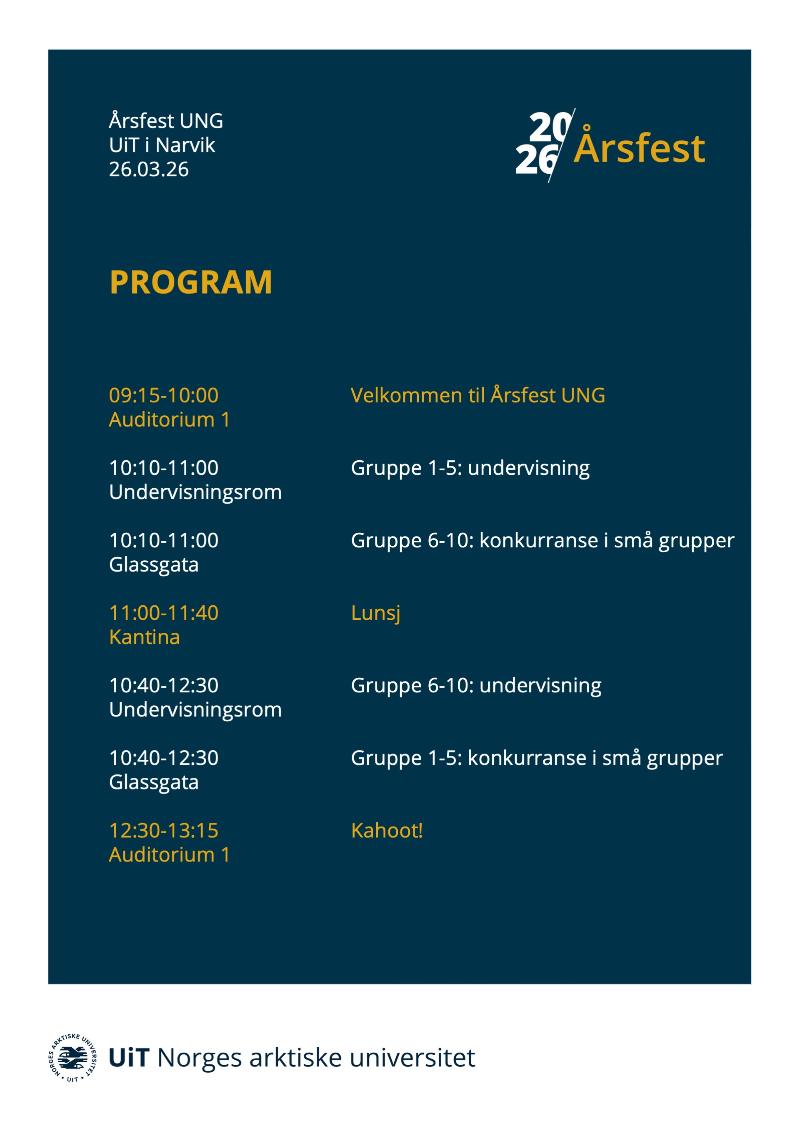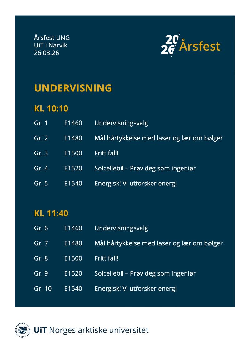 I forbindelse med UiT's årsfest som arrangeres ved alle UiT's campus får vi ved UiT i Narvik besøk av 200 9.-klassinger fra Narvik ungdomsskole torsdag 26. mars. UiT Årsfest UNG er en inspirasjonsdag til høyere utdanning, realfag og teknologi.