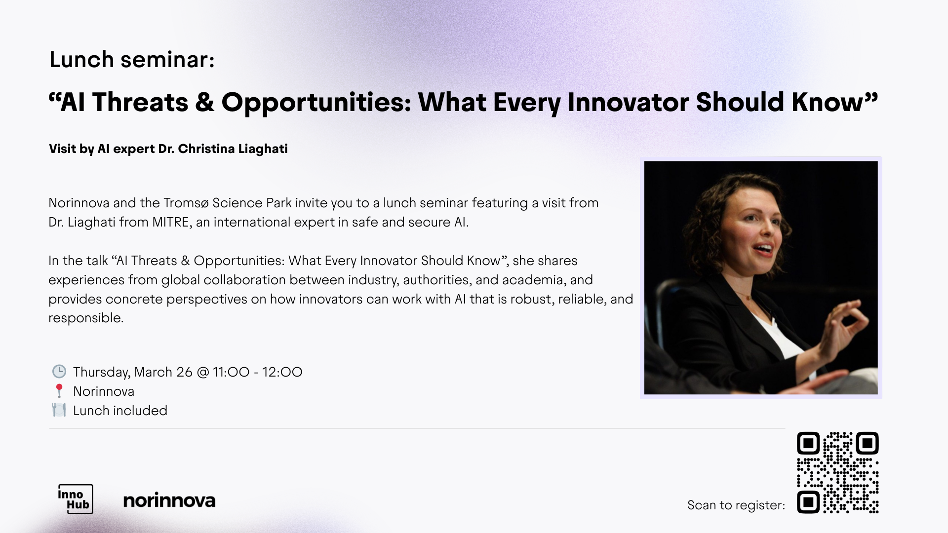 Norinnova and the Tromsø Science Park, in cooperation with UiT's InnoHub, invite you to a lunch seminar featuring a visit from Dr. Liaghati from MITRE, an international expert in safe and secure Al.