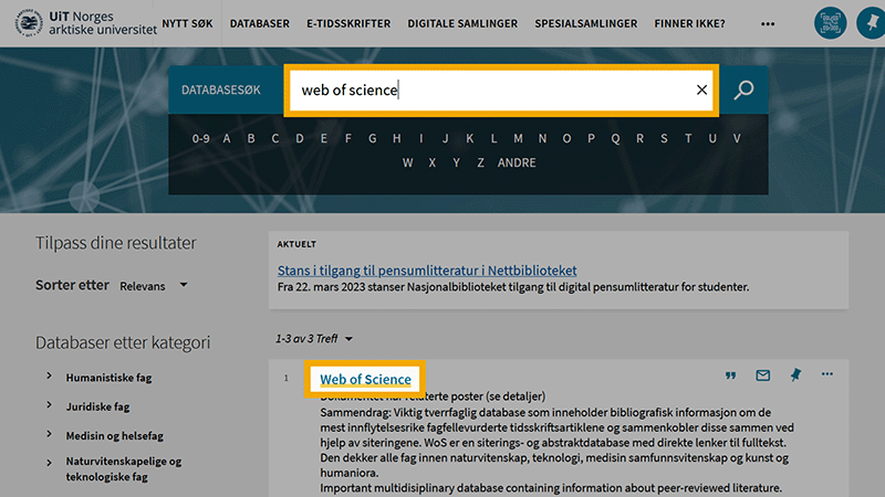 I tillegg til de fagområdespesifikke databasene, tilbyr UB også tilgang til den tverrfaglige databasen Web of Science. Denne egner seg godt til problemstillinger som spenner over ulike disipliner og fagområder, og som et supplement til fagområdespesifikke databaser. Databasen har også sin styrke i at den har rikt med henvisningsdata; informasjon om hvilke dokumenter som henviser til andre dokumenter.