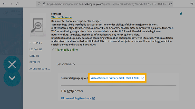 Søk opp og velg ønsket database, f.eks. «Web of Science»