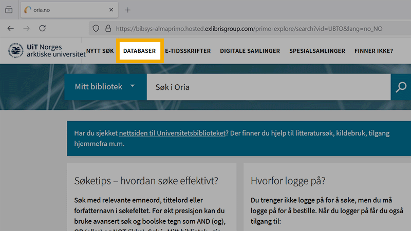For å være sikker på å få tilgang til databasene våre bør du søke dem opp i Oria. Bruk “Databaser”-fanen, som illustrert nedenfor.